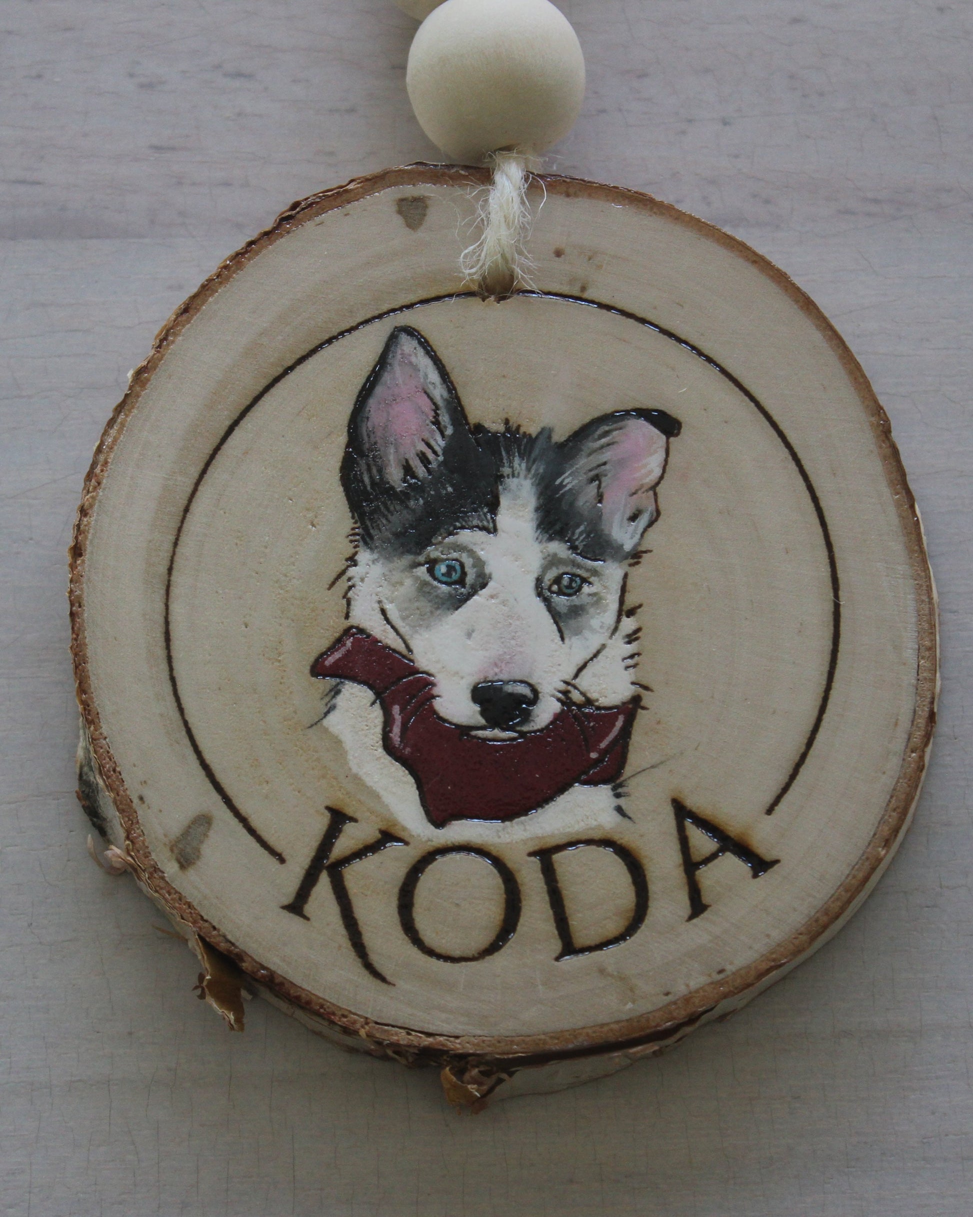 - Includes laser-burned, then hand-painted image of your pet, in a circle border, with their name engraved on the bottom center